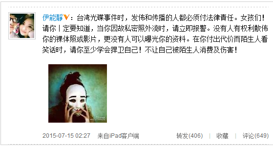台湾光碟事件时,发布和传播的人都必须付法律责任。女孩们!请你一定要知道,当你因故私密照外流时,请立即报警。没有人有权利散布你的裸体照或影片,更没有人可以曝光你的资料。在你付出代价而陌生人看笑话时,请你至少学会捍卫自己!不让自己被陌生人消费及伤害!