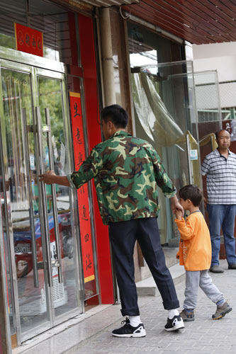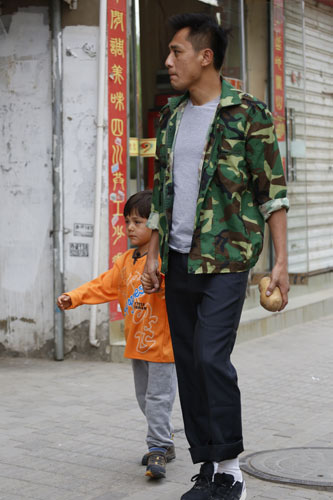 刘烨拿着土豆牵儿子上街