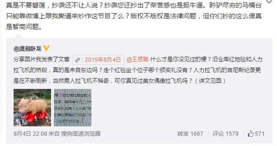而为娱乐圈操碎了心的王思聪,深夜继续反斥,他转发汤集安的微博并配文称:“真是不要碧莲,抄袭还不让人说?抄袭您还抄出了荣誉感也是挺牛逼。黔驴尽穷的马桶台只能靠微博上跟我撕逼来炒作这节目了么?版权不版权是法律问题,但你们抄的这么傻真是智商问题。”