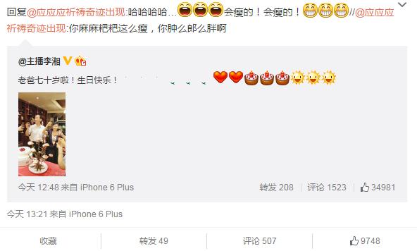随即,有网友转发并质疑:“你麻麻粑粑(妈妈爸爸)这么瘦,你肿么郎么胖(那么胖)啊?”而李湘不但没有生气反倒一笑而过,称:“哈哈哈...会瘦的!会瘦的!”