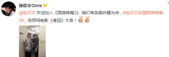 电影《西游·降魔2》由周星驰担任监制,徐克执导,已于8月初开机。此前曝光的演员阵容十分抢眼:姚晨将饰演女一号,一名亦男亦女的道士;吴亦凡饰演唐僧,光头造型在网络上流传,被赋予极大期待出演最帅唐僧;林更新饰演孙悟空;篮球明星巴特尔饰演沙僧;汪铎将出演猪八戒一角。今晚八点,周星驰助理陈震宇晒出包贝尔与星爷合照称,“包包不哭!欢迎加入《西游降魔2》, 咱们有各路妖精为伴。”正式宣布包贝尔将加盟。