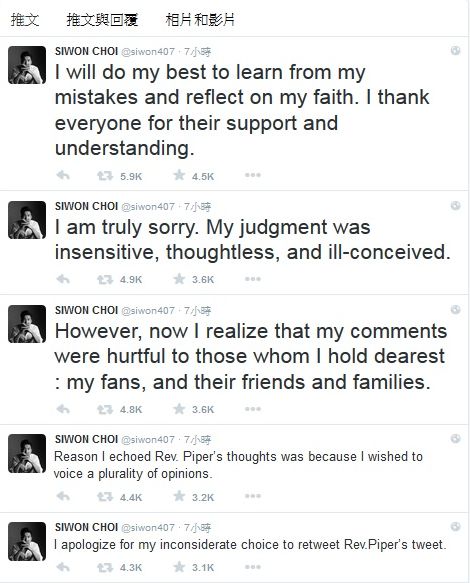 据台湾媒体报道,韩国男团Super Junior成员崔始源前天转贴一位牧师支持美国书记官拒发给同志伴侣结婚证书的言论,被认为是公开支持“反同志婚姻”,遭到挺同志网友抱轰。今日,崔始源连发8则推特道歉“受到伤害的朋友们,向你们致上最深的歉意”,并解释之所以会转发是希望能表达不同的看法。