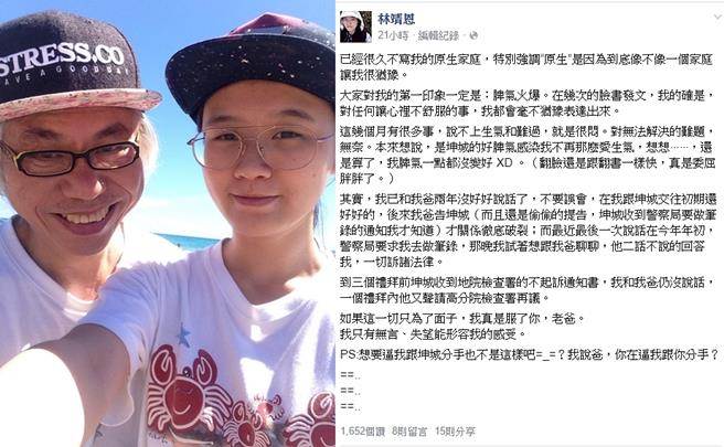 据台湾媒体报道,知名音乐人李坤城与女友林靖恩交往两年多,因40岁的年龄差距受到外界瞩目。日前两人上节目表示明年11月,也就是林靖恩满20岁时结婚,昨(16)日林靖恩在脸书分享亲生父亲状告男友,三周前获不起诉,没想到父亲又申请再议,让林靖恩无言喊话说:“想要逼我跟坤城分手也不是这样吧?我说爸,你在逼我跟你分手?”