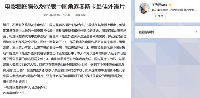 王为民在文章中写道:“不断有各路朋友来电告知,国内某知名境外获奖专业户导演在其微博上爆出,他近期准备在国内上映的一部电影将代表中国参加奥斯卡最佳外语片的评选。大家就此事询问我,电影《狼图腾》代表中国参选明年奥斯卡最佳外语片评选是否依然属实,并让我对那位导演的电影作品做个评价。”