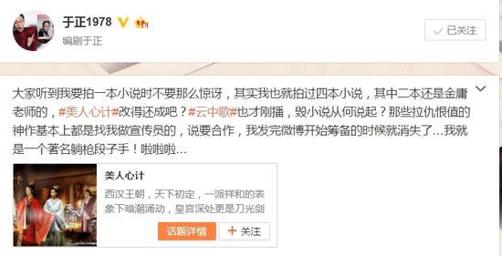 9月17日晚,于正更新微博,回应近日网友吐槽的毁剧之说,称:“大家听到我要拍一本小说时不要那么惊讶,其实我也就拍过四本小说,其中二本还是金庸老师的,《美人心计》改得还成吧?《云中歌》也才刚播,毁小说从何说起?那些拉仇恨值的神作基本上都是找我做宣传员的,说要合作,我发完微博开始筹备的时候就消失了…我就是一个著名躺枪段子手!啦啦啦……”
