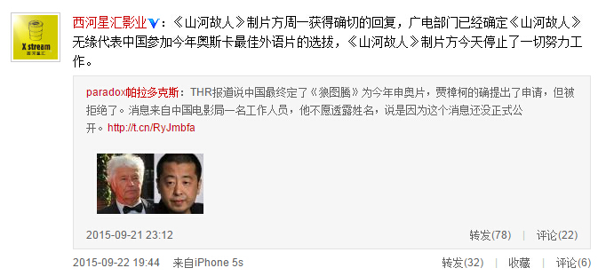 9月21日晚23点12分,名为“paradox帕拉多克斯”的微博网友爆料:外媒称中国最终定了《狼图腾》为今年的申奥片,贾樟柯的确提出了申请,但被拒绝了。消息来自中国电影局一名工作人员。”