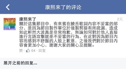 《康熙来了》道歉文:“关于这集节目中,有来宾在饶舌歌词内容不妥当的部分,是因为节目制作单位于后制剪辑有所疏漏,造成如此轩然大波真的非常抱歉,无论如何对于他人直接进行言语攻击都是不妥当的行为,在此对于因节目内容而感动不舒服的人致上歉意,之后我们对于节目内容会更加小心,谢谢大家的关心及提醒。”另据台湾媒体报道,风波后,当事人俊升的脸书也疑似因此关闭。