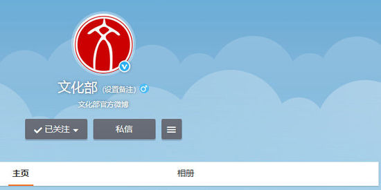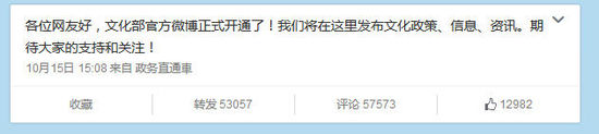 文化部开通官微后于10月15日下午3点8分发出第一条微博,“各位网友好,文化部官方微博正式开通了!我们将在这里发布文化政策、信息、资讯。期待大家的支持和关注。”