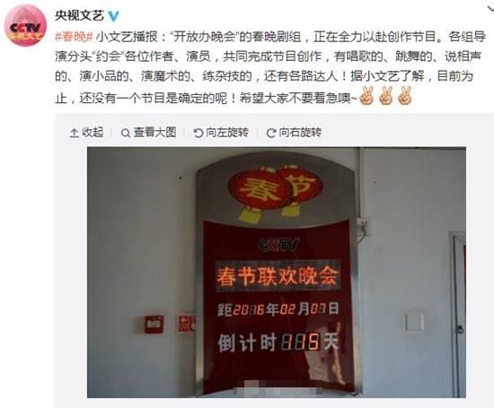 10月15日日,据中央电视台大型节目中心官方微博消息,央视猴年春晚已经开始全力筹备工作,“‘开放办晚会’的春晚剧组,正在全力以赴创作节目。各组导演分头‘约会’各位作者、演员,共同完成节目创作,有唱歌的、跳舞的、说相声的、演小品的、演魔术的、练杂技的,还有各路达人!据小文艺了解,目前为止,还没有一个节目是确定的呢!希望大家不要着急噢”。