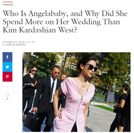 Angelababy与黄晓明的世纪婚礼耗资上亿,惊人程度让美国时尚杂志VOGUE都为她写了一篇线上专栏,表示该婚礼花费的金额赢了当年金-卡戴珊与坎耶-维斯特的惊世婚礼,甚至只比威廉王子与凯特王妃的皇室婚礼少一点点而已,引来大批粉丝惊讶不已。此外,该杂志更提出几点Angelababy稳站亚洲一线女星的原因,其中包括社群媒介的影响力,她光是在微博就有6700万粉丝,Instagram上也有350万关注者,夸张的数字都在显出她的超高人气。