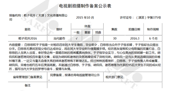 广电总局公布2015年10月全国拍摄制作电视剧备案公示。从公示的备案中可以看到,《栀子花开》电视剧版将于明年3月开机,而经典剧集《新白娘子传奇》也已备案将被重新翻拍!另外,曾在湖南卫视热播过的经典韩剧《咖啡王子一号店》也要翻拍中国版。拍摄制作备案公示表显示,白蛇传将于明年(2016年)6月开机,总集数为60集,制作周期为8个月。《栀子花开》为30集,制作周期是6个月。而《王子咖啡店》(韩剧名《咖啡王子一号店》)也将于明年3月开拍,会用12个月的时间制作出30集的当代都市剧。从剧情看与韩国版的设定相似。
