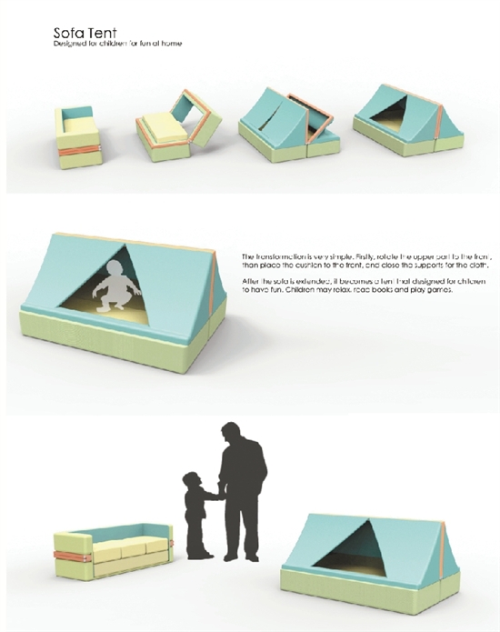 另一件获奖作品是由曾佳旎、孙宇翔、江梦影共同设计的沙发帐篷。他们的灵感也来源于生活——很多小朋友喜欢通过椅子、桌子、毛毯等搭建自己的“小帐篷”,但这样的“小帐篷”并不安全。3名学生在老师施奕腾的指导下,设计出了这款家具、玩具合二为一的沙发帐篷。